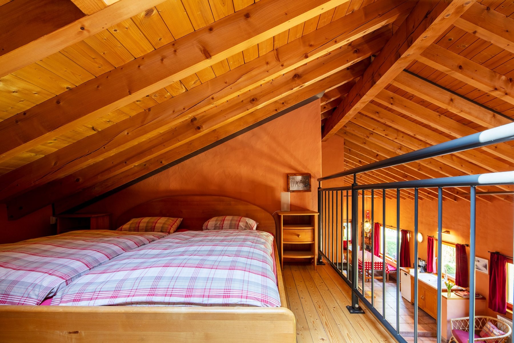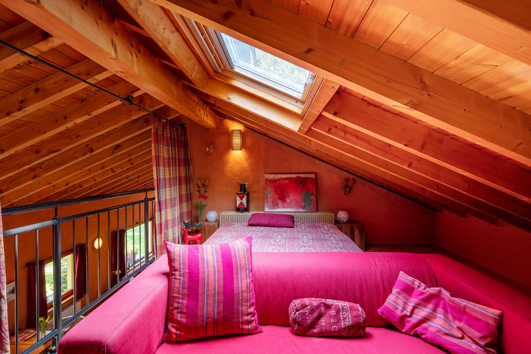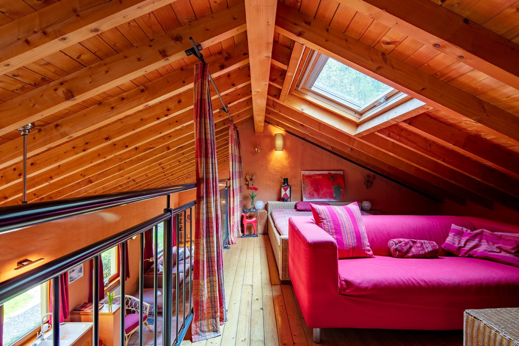 The spacious residential area with a kitchenette is situated on the ground floor. In addition there are two bedrooms, a bathroom and a storeroom located on the ground floor. The first floor offers two more bedrooms on mezzanines.