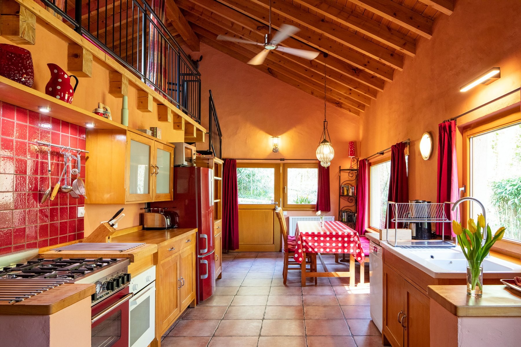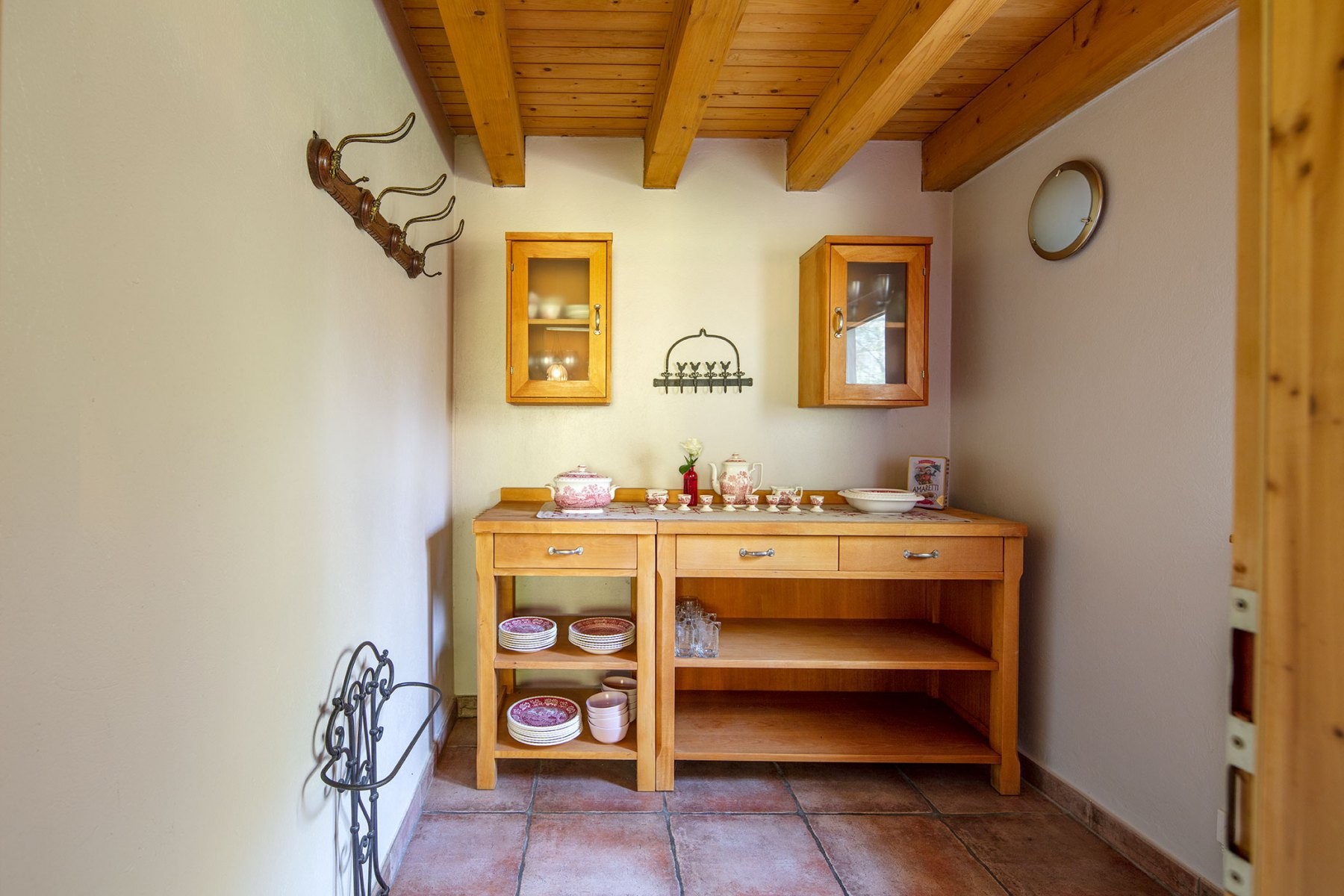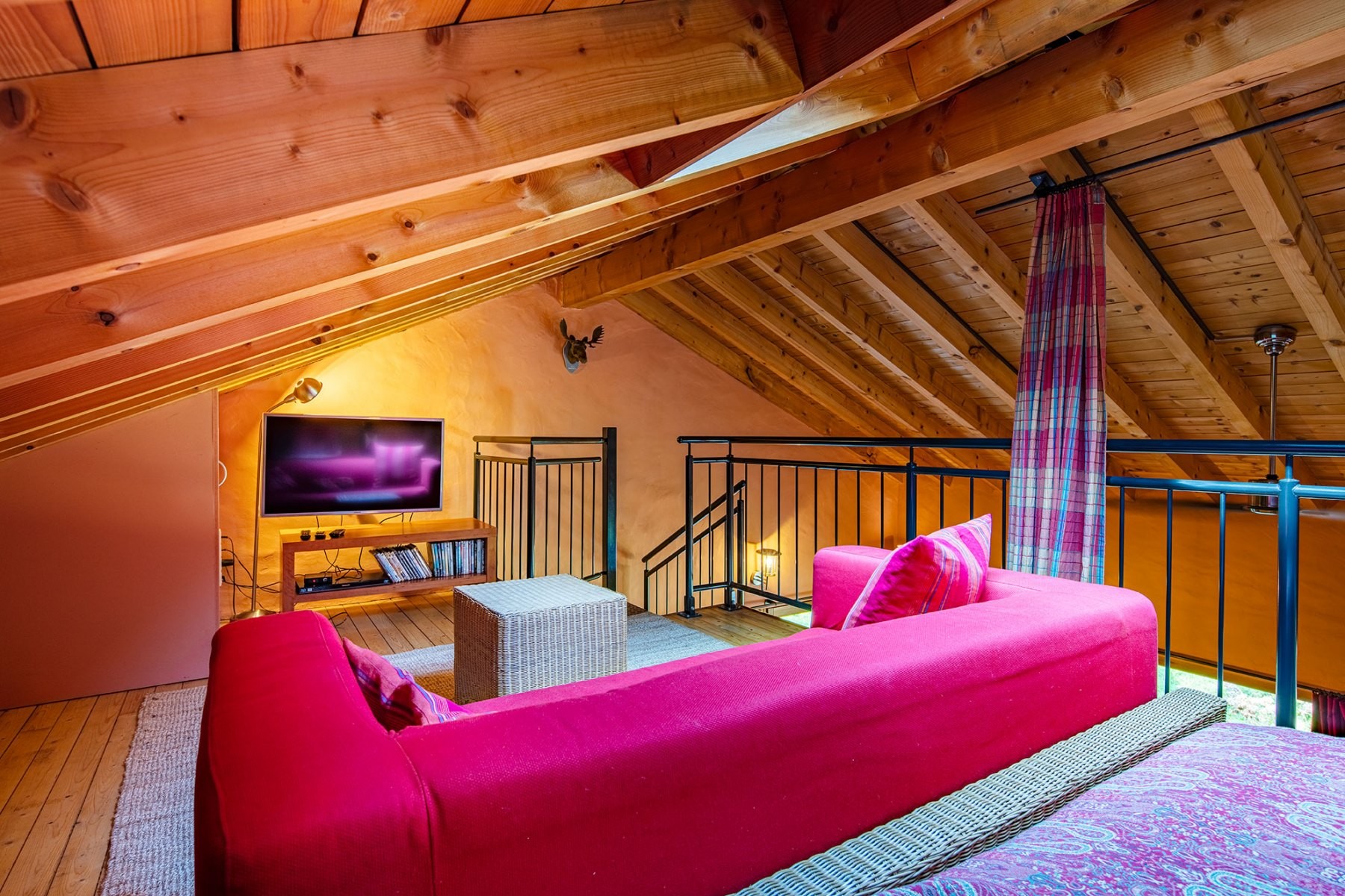 The spacious residential area with a kitchenette is situated on the ground floor. In addition there are two bedrooms, a bathroom and a storeroom located on the ground floor. The first floor offers two more bedrooms on mezzanines.