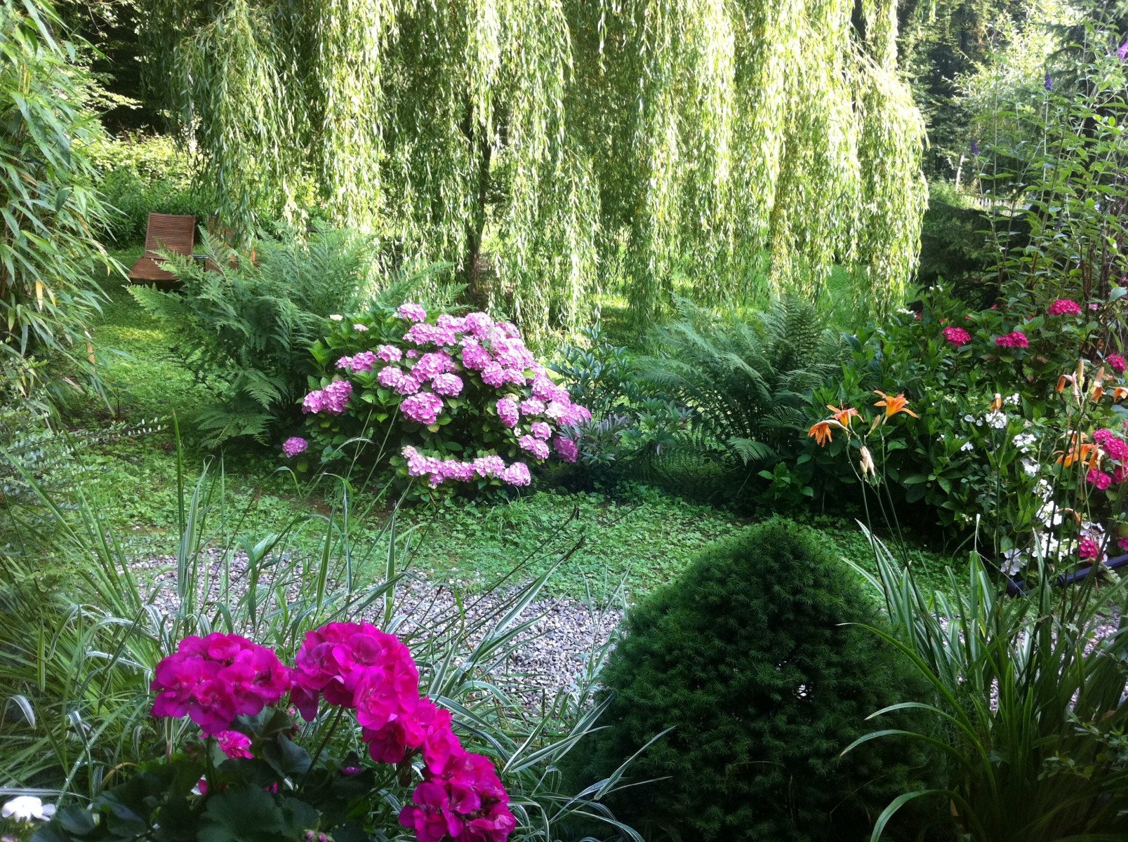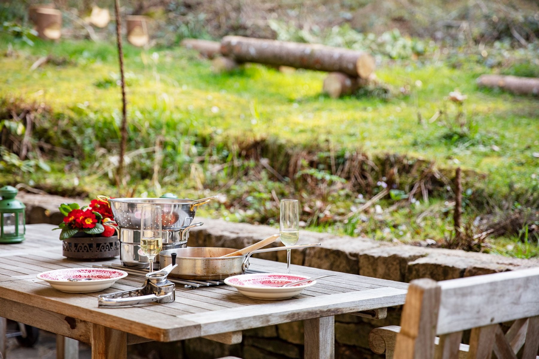 A private area of 60 acres including a spring, a fireplace, a BBQ place, two covered terraces and a big meadow with trees providing shade, belongs to the house.